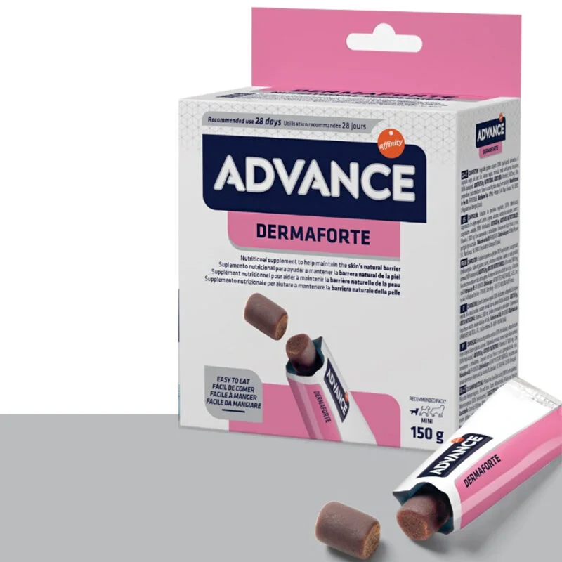 El suplemento nutricional para perros Advance Derma Forte incluye ácidos grasos esenciales para reforzar la barrera epidérmica de las mascotas. Además, incluye ácidos grasos omega 3 (EPD y DHA) que ayudan a reducir la inflamación, contribuyendo a disminuir los signos de la dermatitis. También contiene ácidos grasos omega 6 (linoleico y GLA), que mejoran la barrera cutánea, ya que ayudan a cohesionar las células de la epidermis y a mejorar el aspecto de la piel y el pelo.
