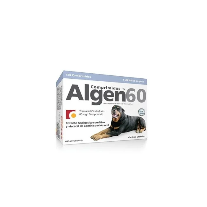 Algen 60 Mg 120 Tabletas es un potente analgésico y antiinflamatorio para mascotas, diseñado para tratar el dolor agudo y crónico en perros y gatos. Con Tramadol como principio activo, Algen 60 mg 120 comprimidos alivia eficazmente el dolor causado por fracturas, lesiones, luxaciones y neuropatías. Su acción prolongada de 6 a 8 horas garantiza un control efectivo del dolor, ayudando a mejorar la calidad de vida de tu mascota. En Mastica, encontrarás siempre el mejor precio para cuidar a tus animales.