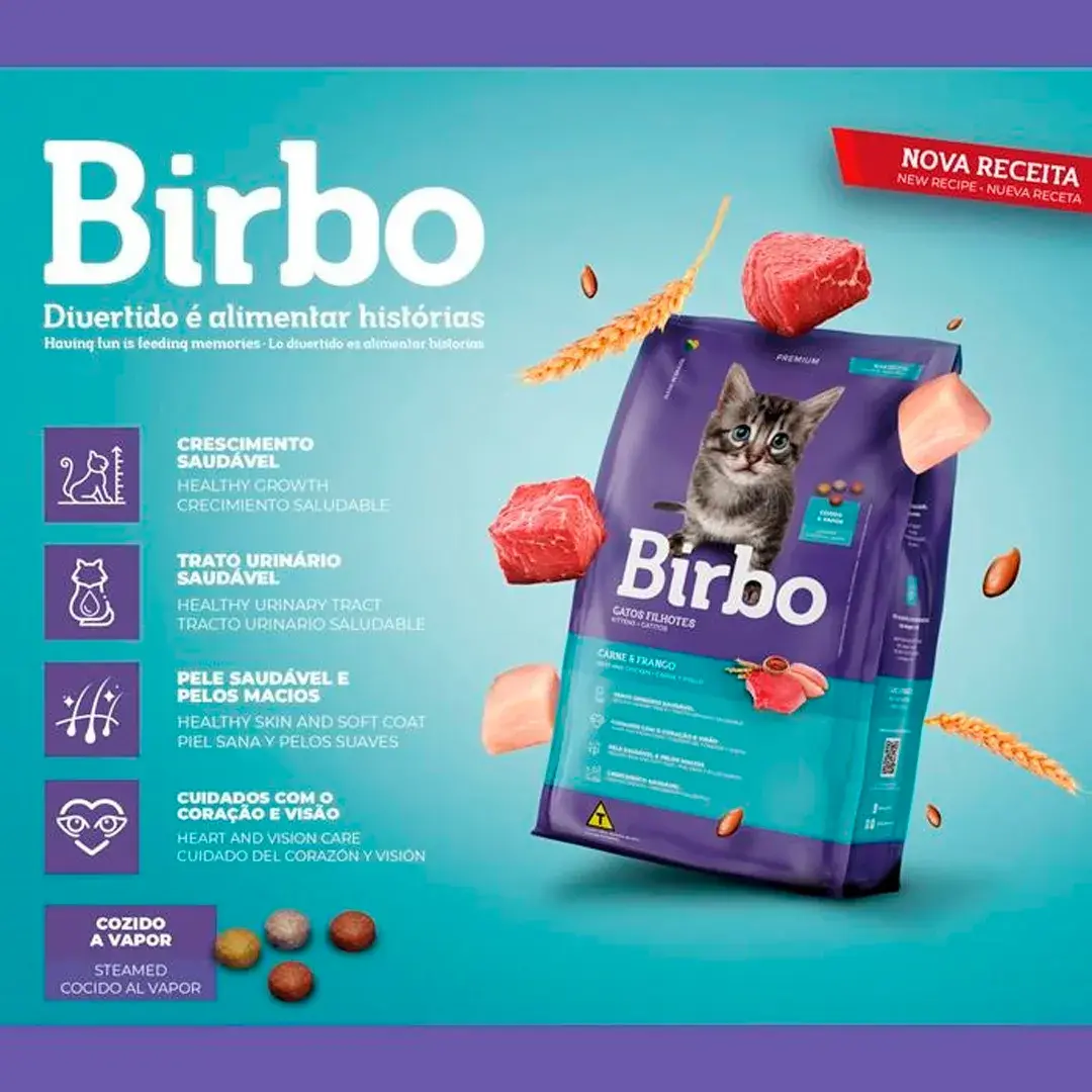 BIRBO GATITO CARNE Y POLLO es elaborado con nuggets desarrollados para agradar al paladar exigente de los felinos. Alimentación completa y balanceada, con ingredientes seleccionados, enriquecida con vitaminas y minerales en niveles adecuados a los gatos adultos. Birbo Premium Gatos Carne y Pollo contiene Nuggets rellenos proporcionando una comida sabrosa y posee Omegas 6 y 3, Taurina, aminoácido esencial a la dieta de los gatos, que auxilia en la prevención de problemas visuales y cardíacos, y contiene extracto de Yucca Schidigera, que actúa a nivel intestinal reduciendo el olor de las heces.