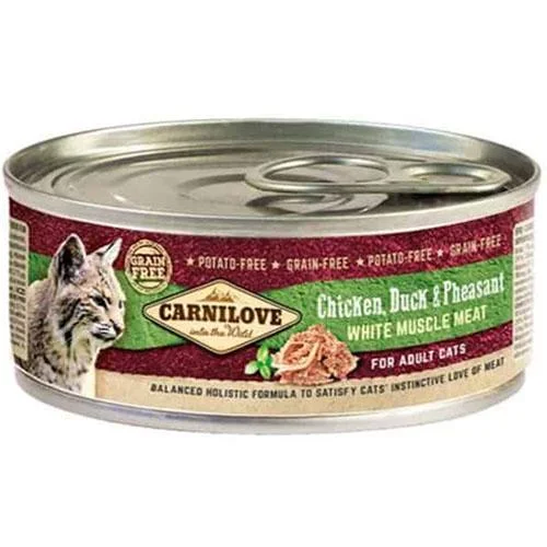 El alimento húmedo para gatos de pollo, pato y faisán CARNILOVE contiene un 55% de carnes de origen silvestre (carne de músculo blanco) y es un alimento completo que no contiene cereales ni patatas.