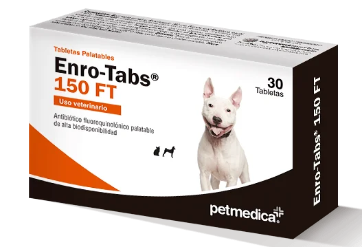 Enro-Tabs® 150 FTTabletas Palatables está indicado para su uso en el tratamiento de infecciones bacterianas -asociadas con bacterias susceptibles a la enrofloxacina- en: Tracto digestivo: causadas por E. coli, Salmonella, Proteus spp. Tracto Respiratorio: causadas por Pasteurella spp., Bordetella spp., Klebsiella spp. Tracto Urogenital: nefritis, pielonegritis, cistitis (E. coli, Corynebacterium piogenes, Staphylococcus aureus, Streptococcus spp., Pseudomona aeruginosa). Heridas infectadas y septicemias. Infecciones cutáneas: dermatitis, piodermas, (E. coli, Klebsiella spp., Staphylococcus aureus, Streptococcus spp., Pseudomona aeruginosa). Infecciones del conducto auditivo externo: otitis (E. coli, Staphylococcus aureus, Streptococcus spp., Pseudomona aeruginosa).