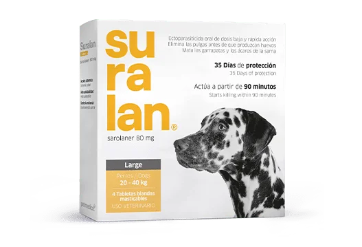 No dejes que pulgas, garrapatas o ácaros afecten la salud de tu mejor amigo. Con Suralan, brindas una solución confiable, segura y práctica para mantenerlo libre de parásitos externos durante todo el año. Consulta con tu veterinario y elige la presentación adecuada para tu perro.