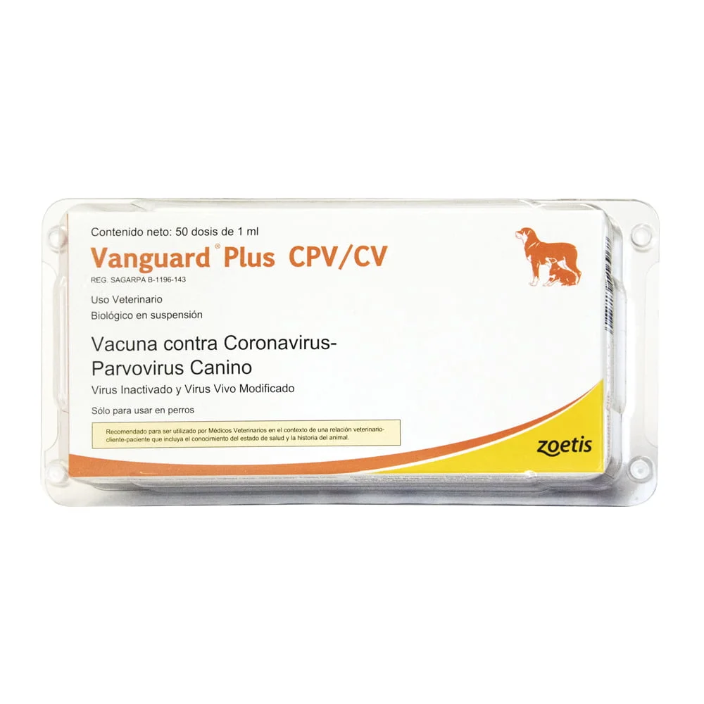 Vanguard® Plus CPV/CV es para la vacunación de perros sanos de 6 semanas de edad o mayores, como una ayuda en la prevención de la Enteritis causada por el Coronavirus Canino y el Parvovirus Canino. Para la vacunación de perros sanos. Agitar bien y administrar 1 ml subcutánea o intramuscularmente.